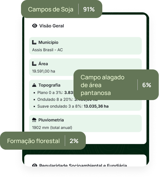 Analise dezenas de cruzamentos de dados como outorgas de água e mineração, embargos ambientais, desmatamento, condições agrícolas e geológicas, e muito mais. O poderoso motor de Inteligência Artificial lhe possibilitará conhecimento e segurança sobre seu território de forma simples, profunda e imediata.